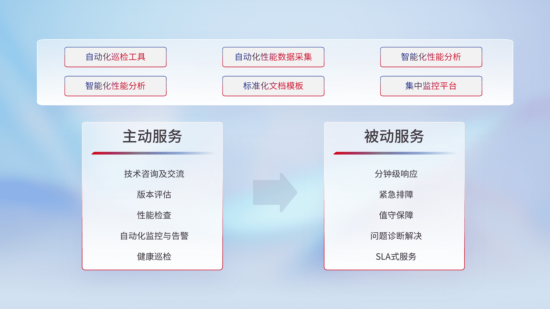 智能化工具和标准化文档,,,,保障服务质量,,,提供主动服务(包含技术咨询、、、版本评估、、、性能检查、、、自动化监控与告警、、健康巡检)和被动服务包含(分钟级响应、、、、紧急排障、、、、值守保障、、、问题诊断解决、、、、SLA服务)。。