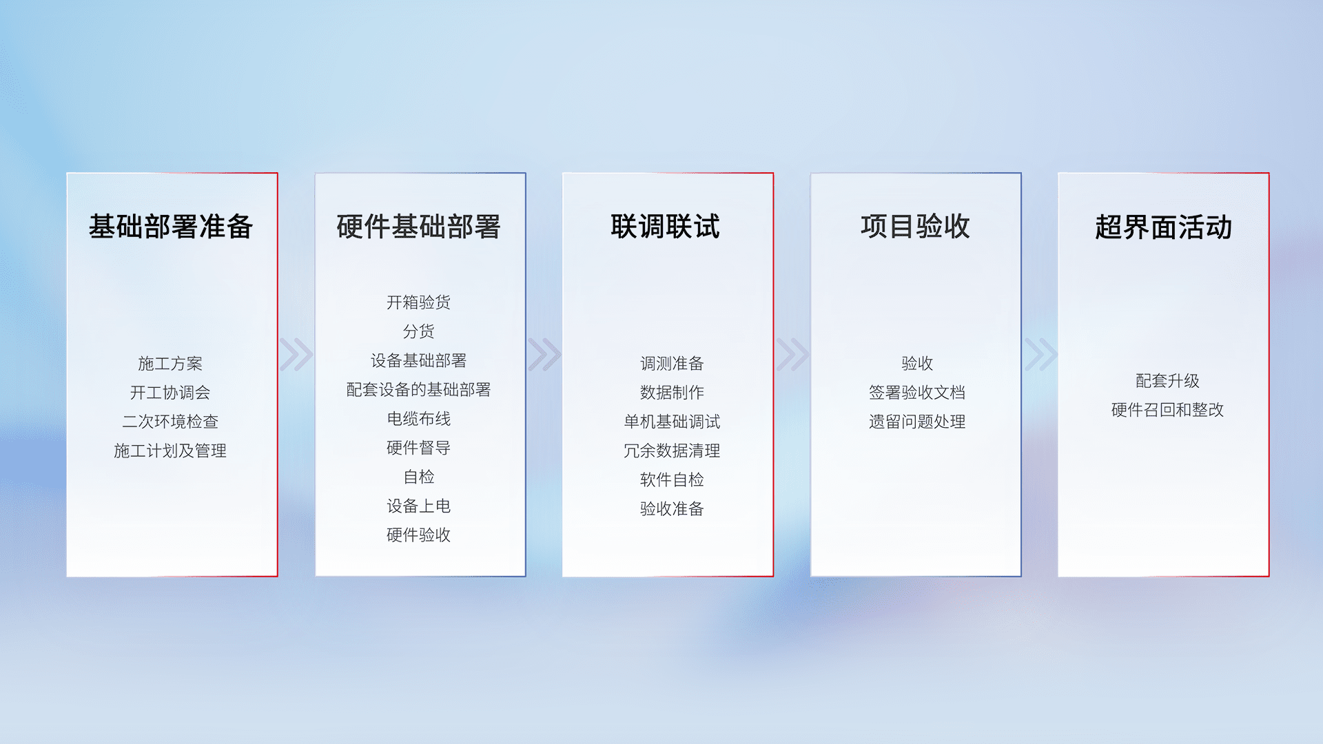 从基础部署准备、、、硬件基础部署、、、联调联试、、、、项目验收、、越界面活动的全过程可追溯,,,,保证施工质量和进度。。。